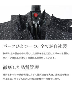 機能性も非常に優れており、なかでも風に強いのが特長。六角形のシャフトやグラスファイバー製のフレームなど、他にはない独自の構造で長く愛用できるように作られています。